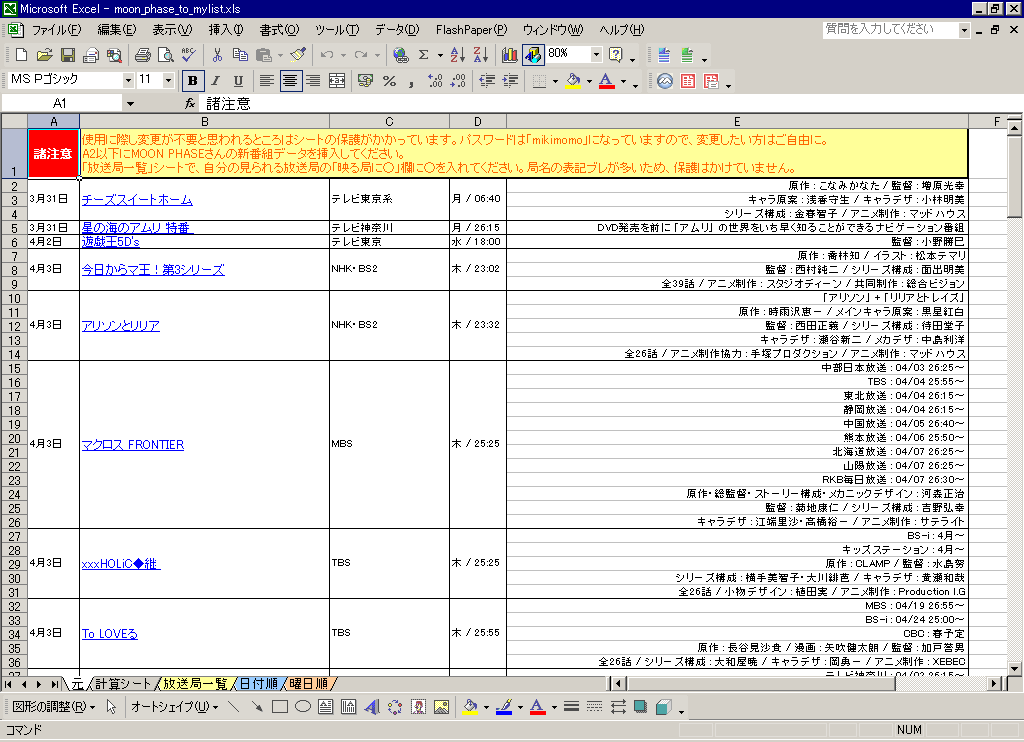 ですが、MOON PHASEさんの新番組情報の表は、最速放送日/キー局順になっており、そのままではいまいち、自分の環境下で見られるのはどの番組で見られる放送局ではいつ開始なのか、何曜日の番組なのかがパッと見わからないということがあり、結局はExcel等を使いつつ自分に必要な情報のみ取り出すという作業をほぼ手作業でやっていました。
